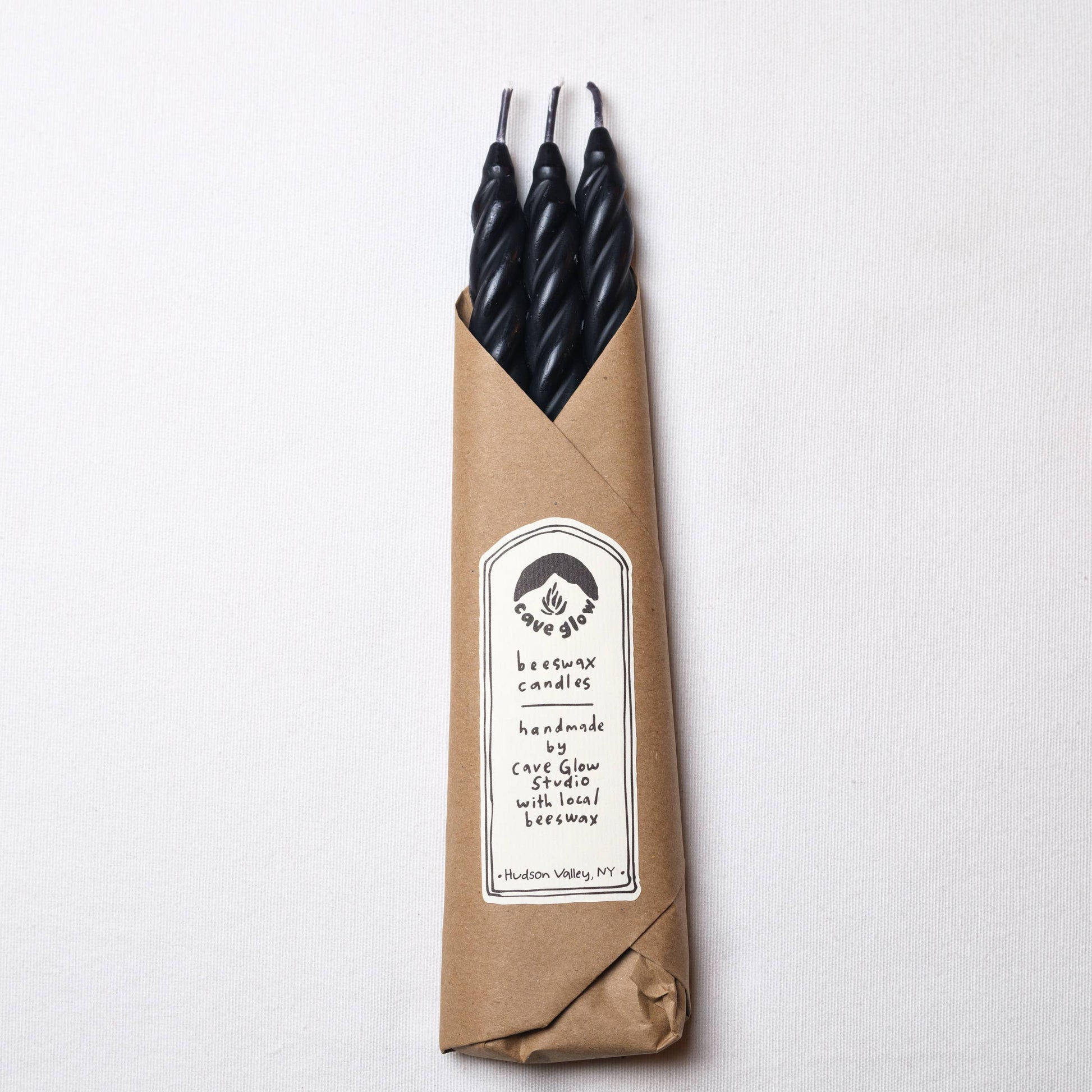 Our Black Beeswax Taper Candles Set comes with three matching hand-crafted 9” spiral beeswax candles. These candles are made with pure beeswax, cotton wicks and natural dye. We hand-craft each candle in small batches in our studio in the Catskills, NY.