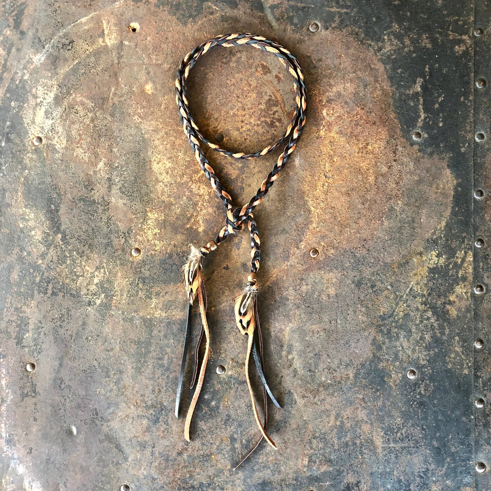 The braided deerskin leather is finished with handmade copper beads and pheasant feathers.