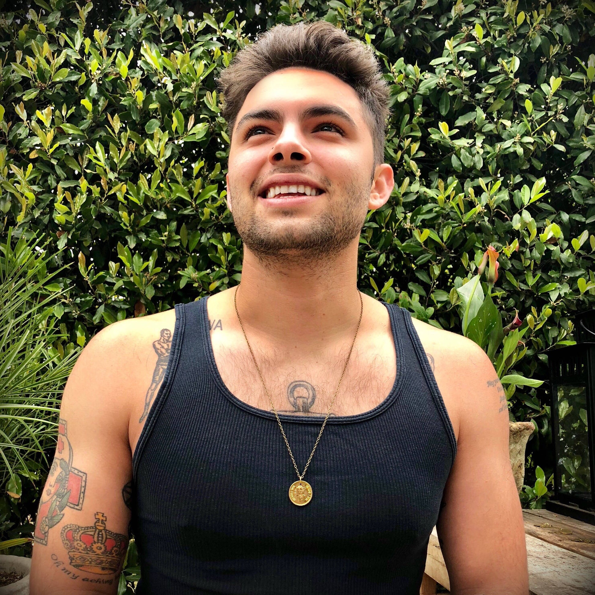 It dangles from a 26" antique brass chain. Finished with a brass lobster clasp.
