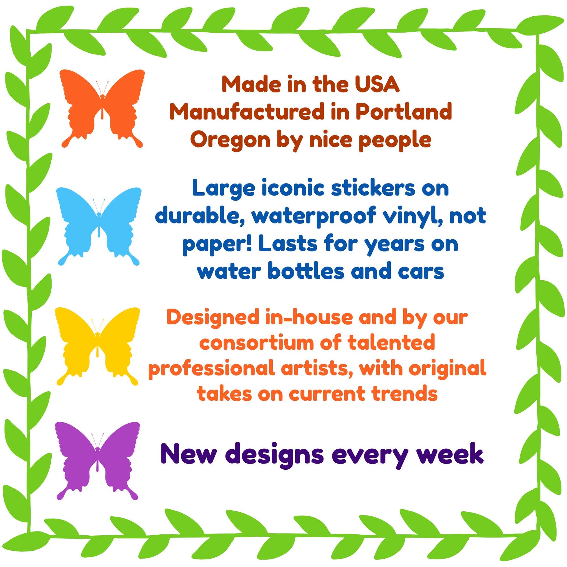 Like all of our stickers, these are made of the highest quality thick, glossy, waterproof vinyl. They will last for years on a water bottle or a car. We work with a small professional sticker manufacturer based in Portland Oregon (who also happen to be awesome people!) to ensure that we have the best stickers on the market.